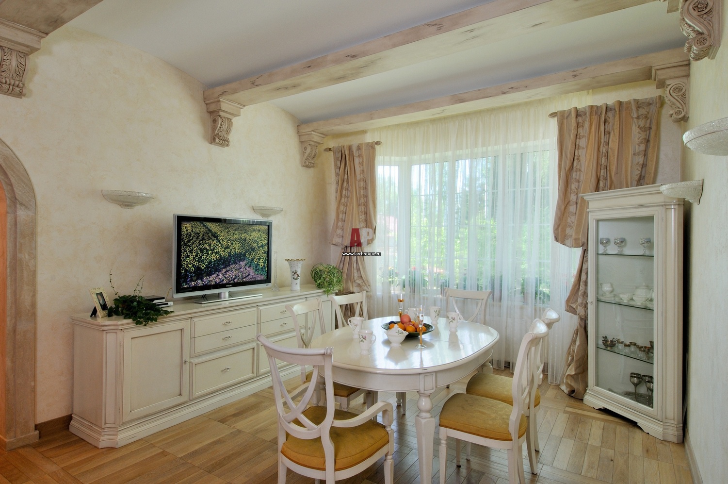 Небольшая, уютная столовая выполнена в общей стилистике с кухонной зоной. Эркерное окно вносит в помещение дополнительный свет и распахивает вид на ухоженный ландшафт за окном, дизайнер Андрей Горбачев, компания «Природный парк».