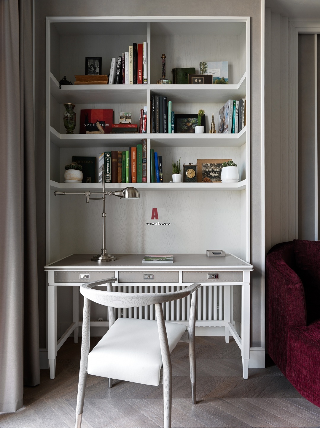 В другой нише находится рабочая зона дизайнера – хозяйки квартиры. Вся мебель изготовлена на заказ из беленого ясеня.