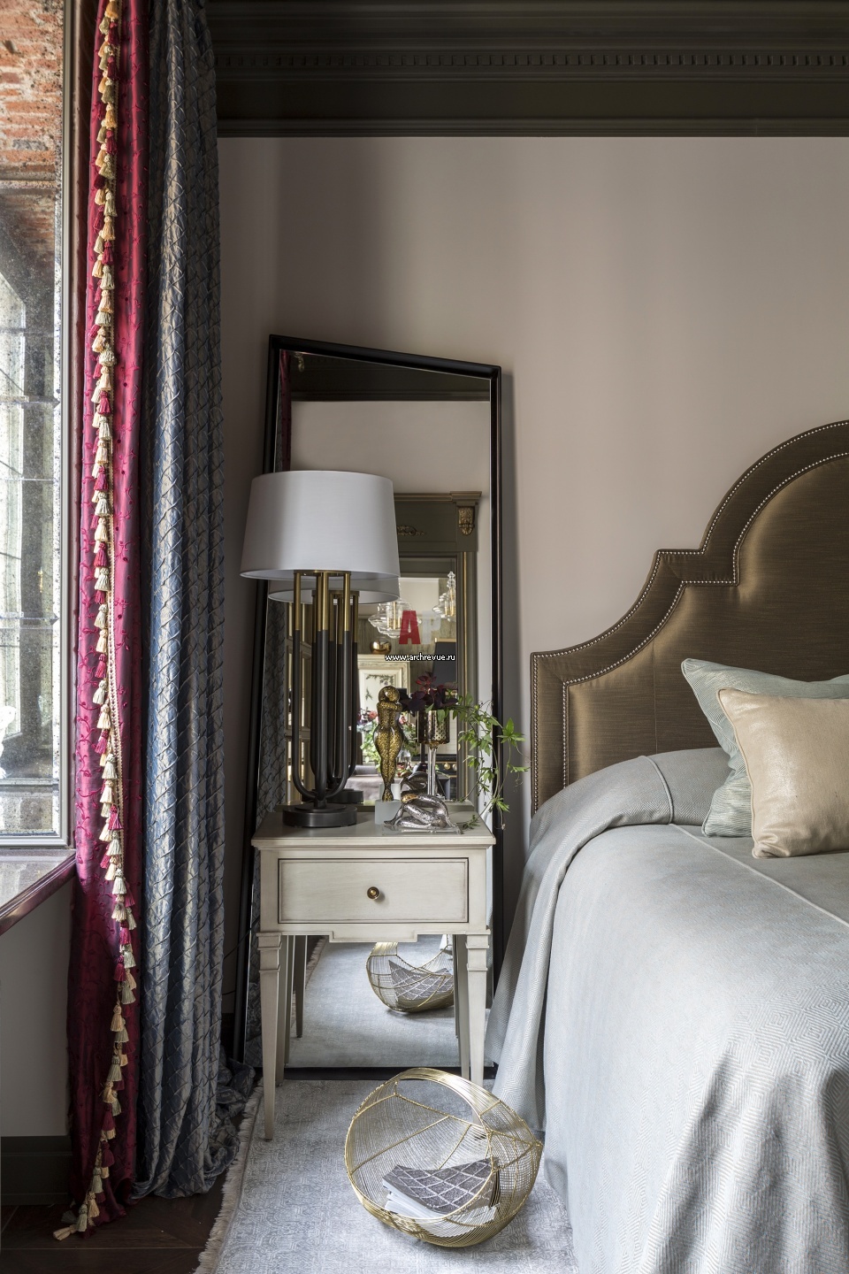 Фото эклектичной квартиры с элементами стиля лофт и парадной классики. Интерьер спальни. Важную роль играют и ткани: плотные, тяжелые, будуарные портьеры и обивки из бархата и шелка подчеркивают камерный характер интерьера.
