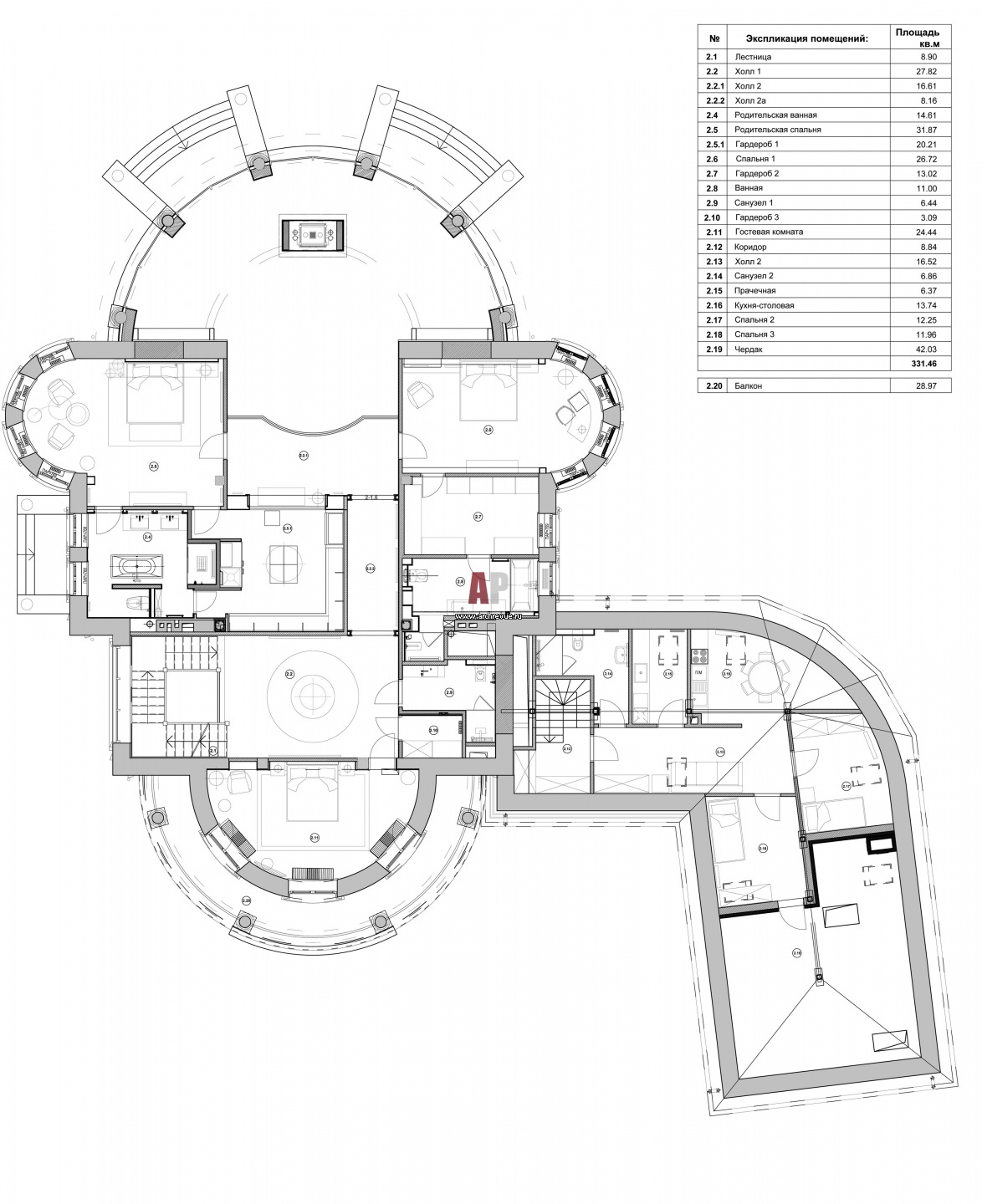 Планировка 2 этажа 3-х этажного особняка в Подмосковье.
