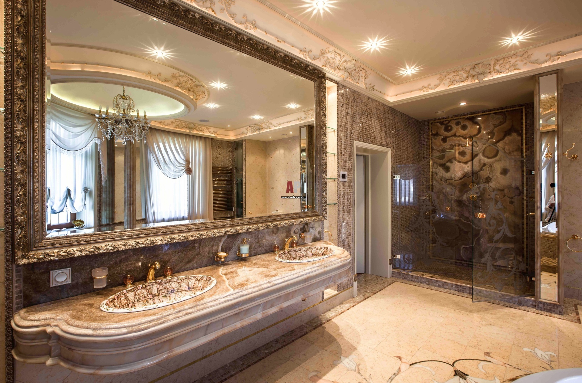 Интерьер ванной комнатой также вдохновлен темой цветущего сада. Раковины Kohler украшены ручной росписью с флористическим мотивом. Смесители в золотой отделке.