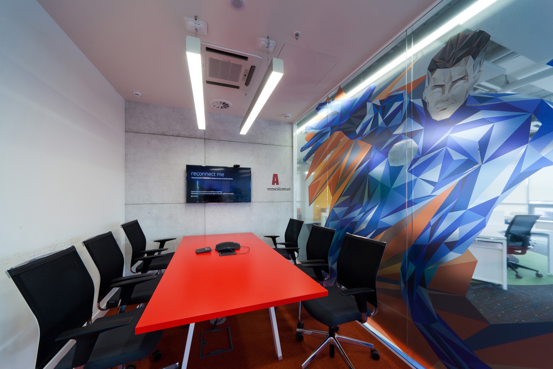 Фото интерьера переговорной с изображением с упер-героя. С дизайне офиса использовано стекло различных вариаций — прозрачное, матовое, с рисунком.