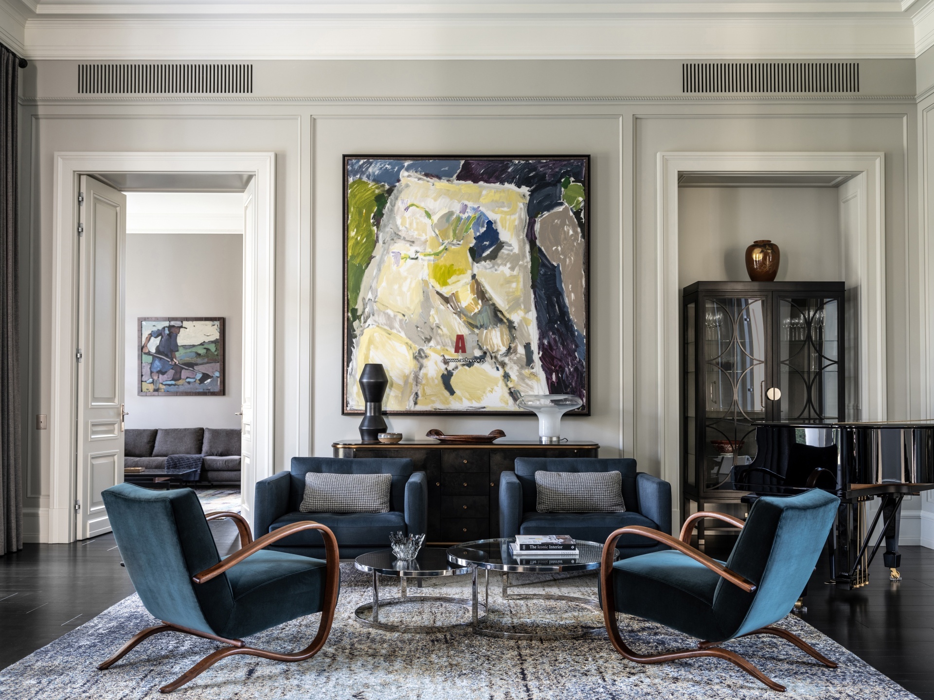 Гостиная площадью 75 кв. м разделена на две зоны: музыкальную, с роялем и удобными креслами для слушателей, и каминную зону. На полу – ковры дизайна Зои Лондайк (Zoe Luyendijk). Кресла, B&B Italia и винтаж. Журнальный столик, JNL. Комод, Julian Chichester. На нем – светильник Artemide, Lesb. Витрина, Hickory White. В центре не стене – картина «Дачный натюрморт» Кирилла Василенка.
