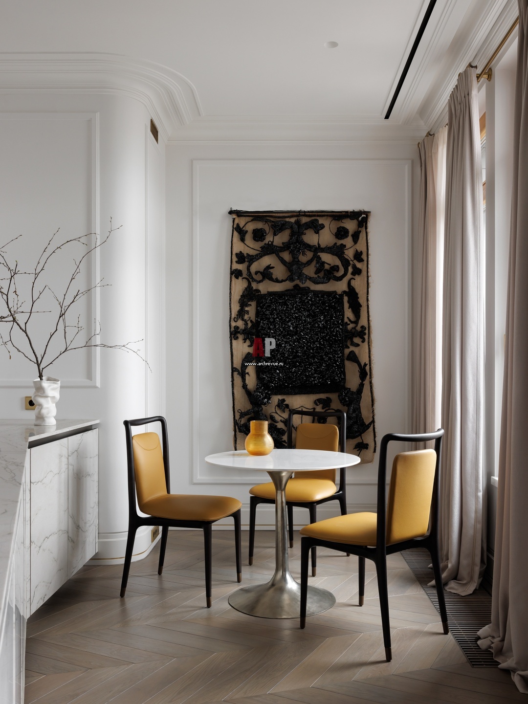 Акцентная зона для завтраков на кухне. Основание стола для завтрака, Julian Chichester. Столешница выполнена из мрамора. Стулья, Giorgetti. Декоративное панно Елены (Алисон) Камаевой.