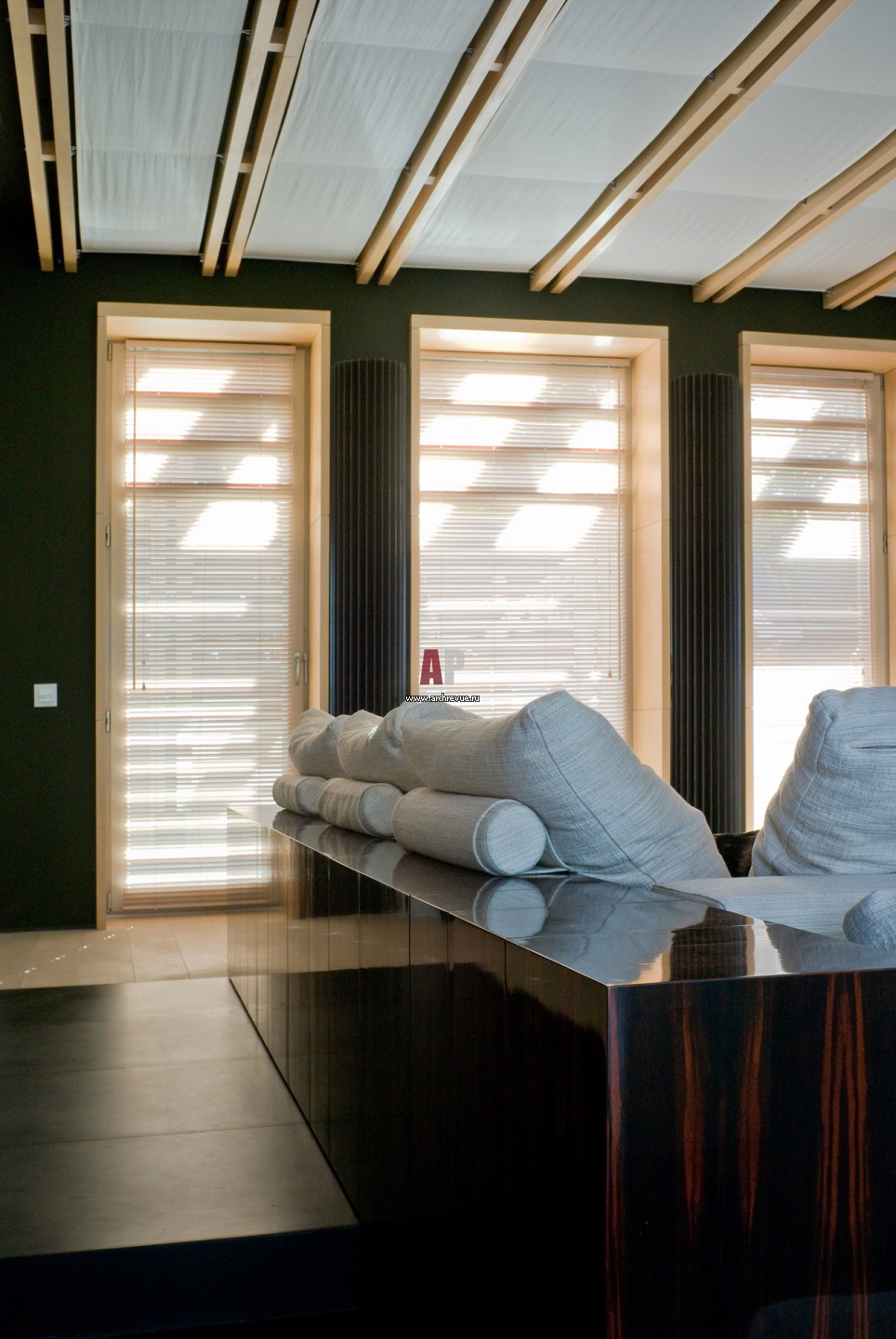Потолок в гостиной частично задекорирован тканью, через которую светят лампы. Часть поверхности обшита деревом. Работа с деревом, компания Tudor.
