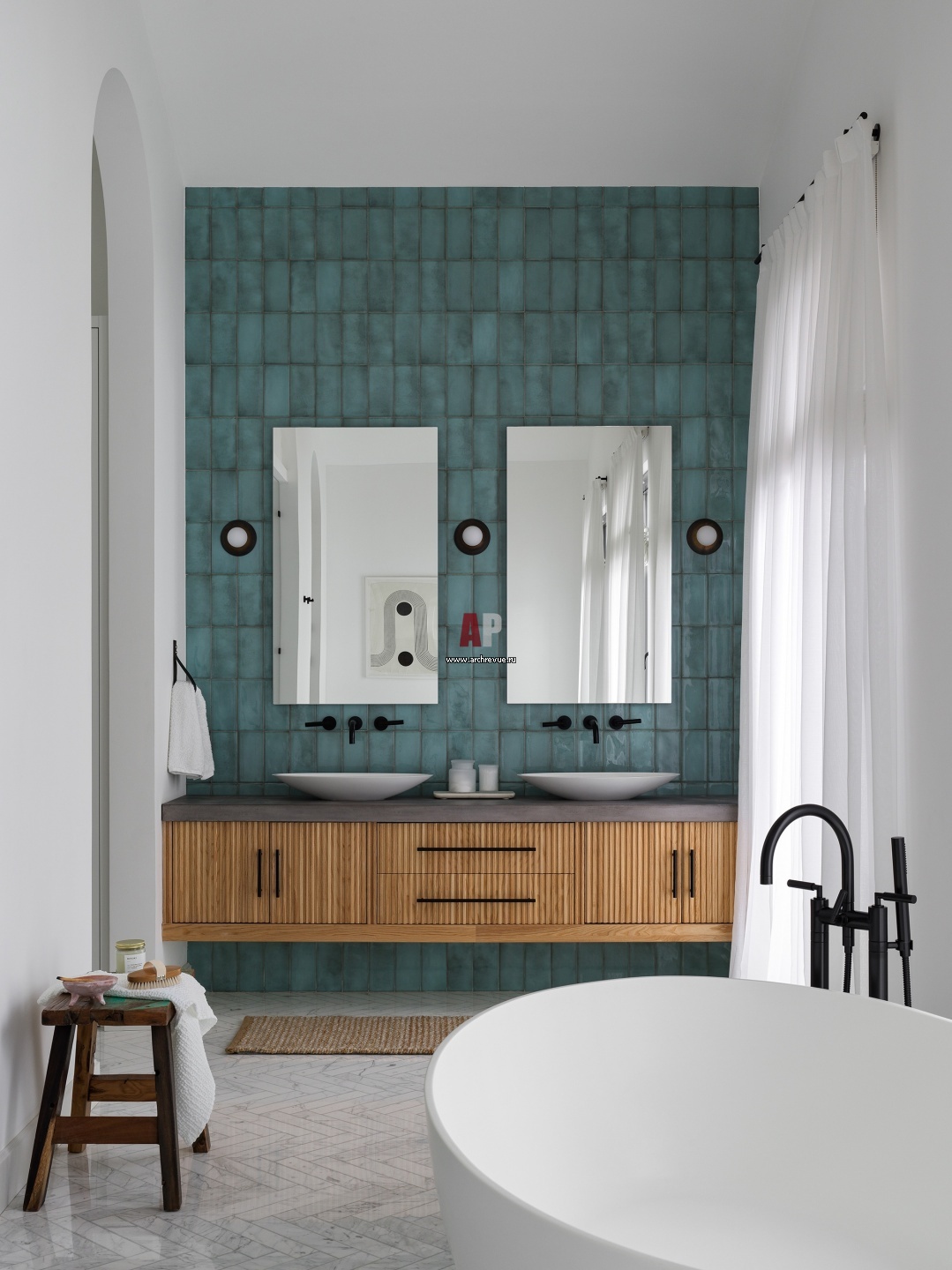 В ванной при хозяйской спальне сине-зеленую поддерживает более насыщенная по тону зеленая мозаика. Бра, Allied Maker. Раковины, Cocoon. Смесители, Dornbracht.