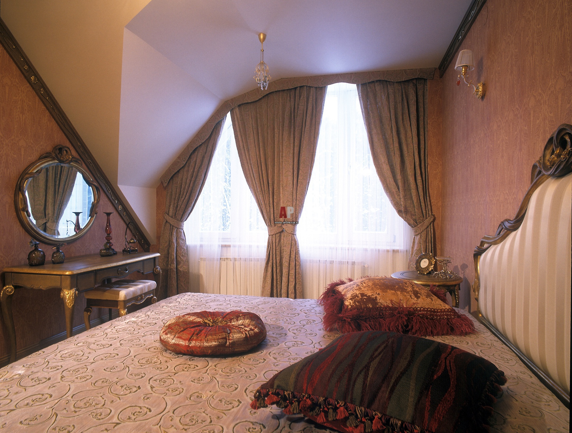 Стены в спальне оформлены обоями цвета бордо. Кровать с затейливой спинкой, тумбочки Savio Firmino.