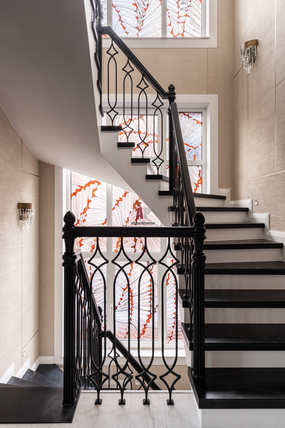 Одно из главных украшений лестничного холла – авторские витражи ручной работы в стиле ар-деко. Они выполнены мастерами из Калининграда, художники Александр Сплошной и Александр Полежаев.