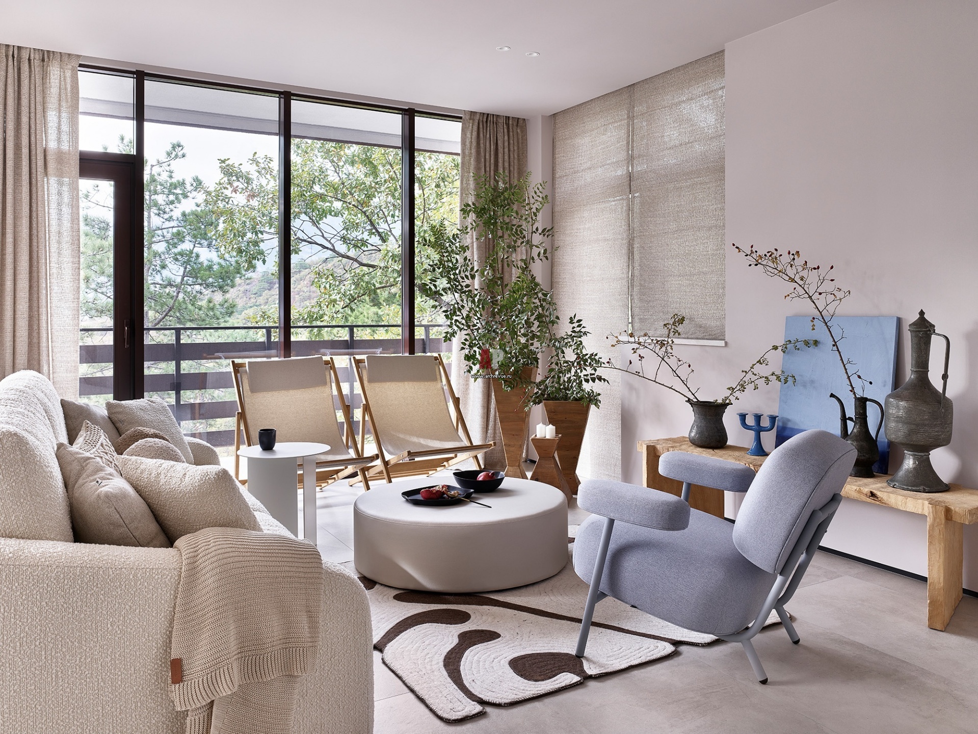 Общая гостиная на втором уровне. Диван, The Idea. Пуф, Annki Studio. Лавка, Karenga. Кофейный столик, Ominimalism. Кресло, Delo Design.
