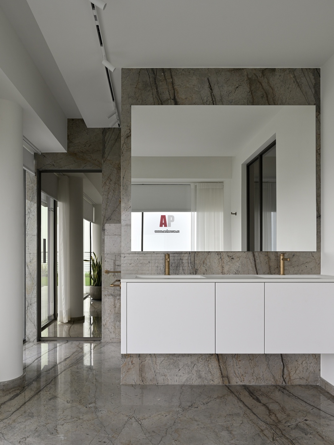 Хозяйская ванная комната оформлена в сдержанной манере с использованием фактуры камня. Акцент сделан на вид из окна.