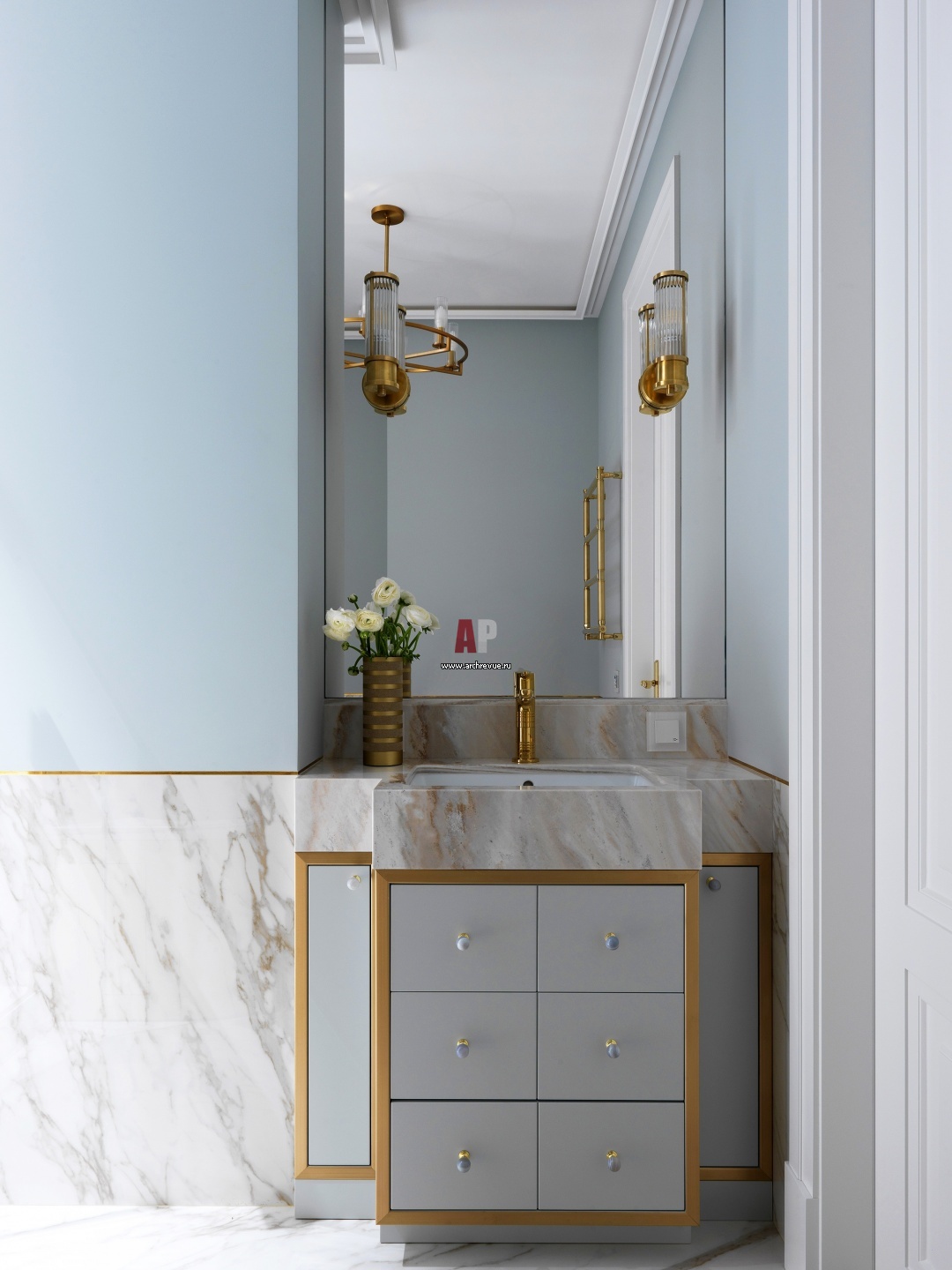 Инвестиционная квартира на Остоженке. Детский санузел. В оформлении использованы элементы из латуни. Умывальник изготовлен на заказ.