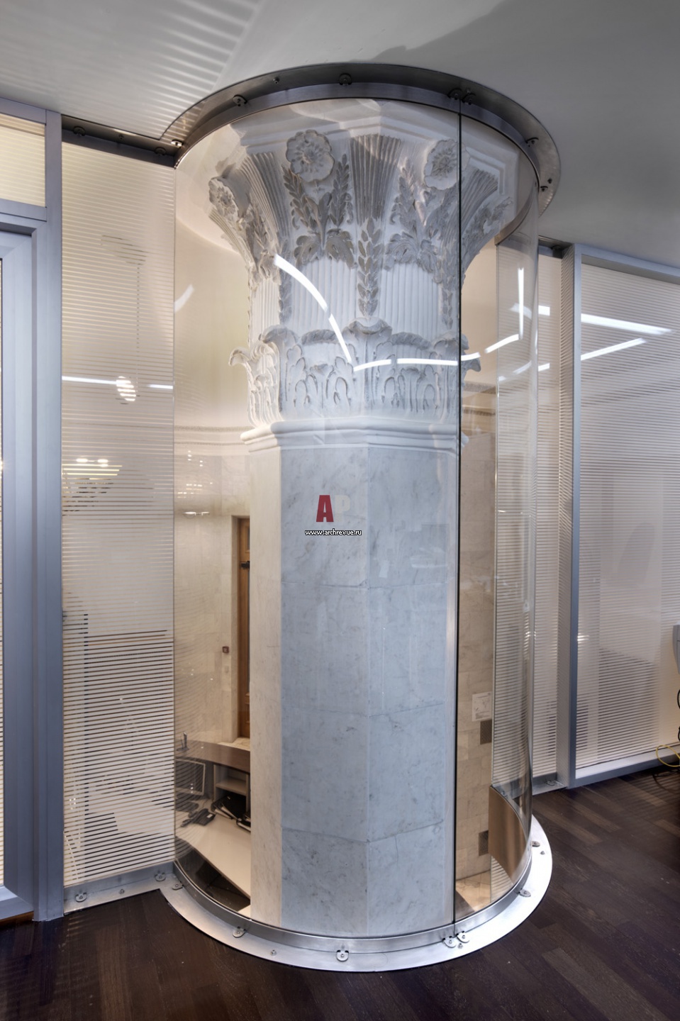 Фрагмент интерьера рабочей зоны второго этажа. Стеклянная стена огибает несущую колонну в стиле ампир. Стеклянные панели смонтированы на металлических крепежах и болтах.