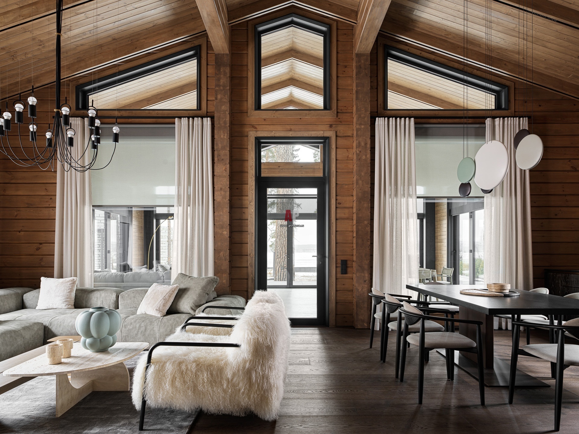 Современное шале в Свердловской области. Общая гостиная с панорамным видом на природное окружение и выходом на утепленную террасу.