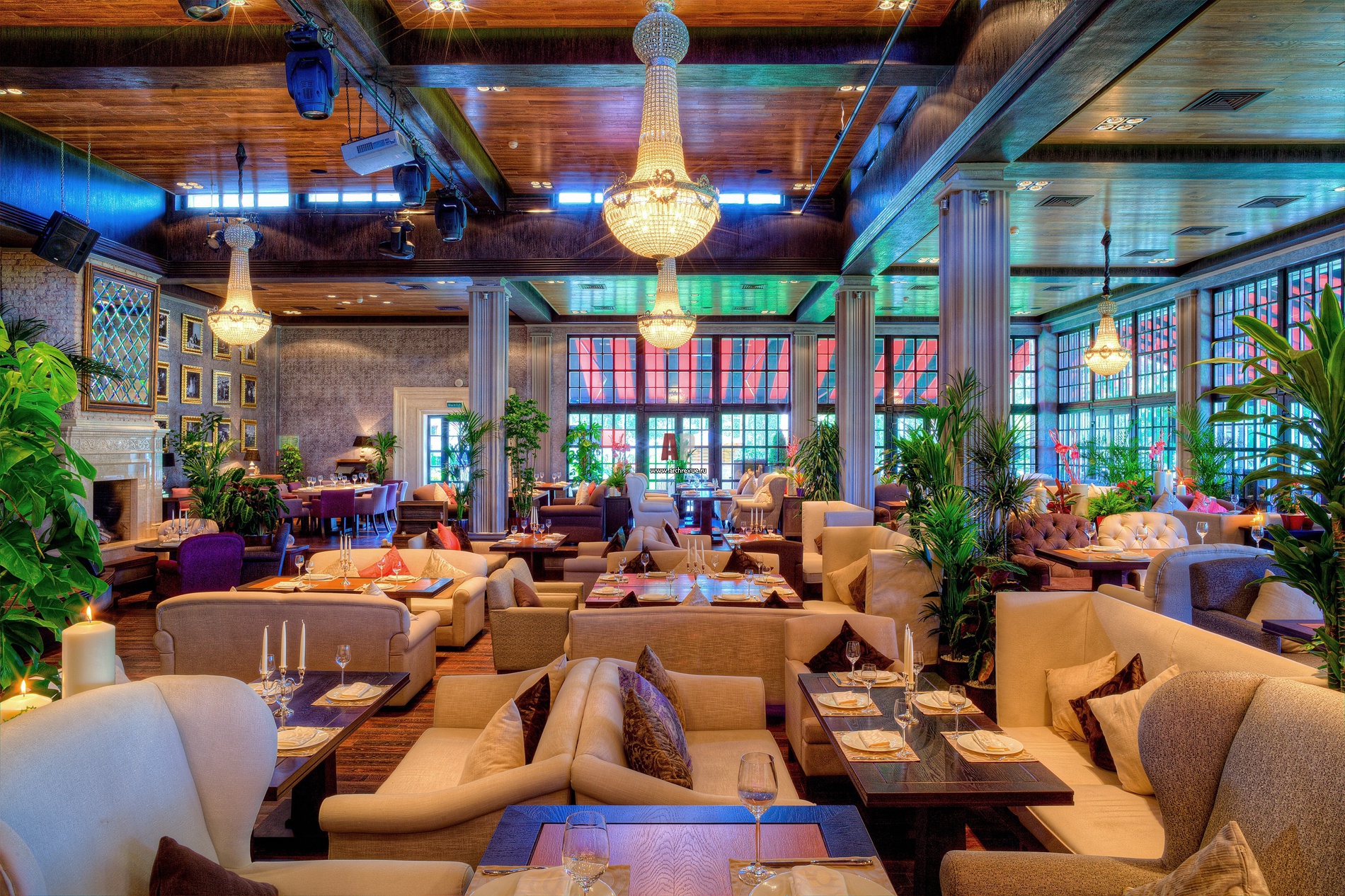 Важная составляющая образа интерьера – панорамные окна с частыми деревянными переплетами и фацетными стеклами.
