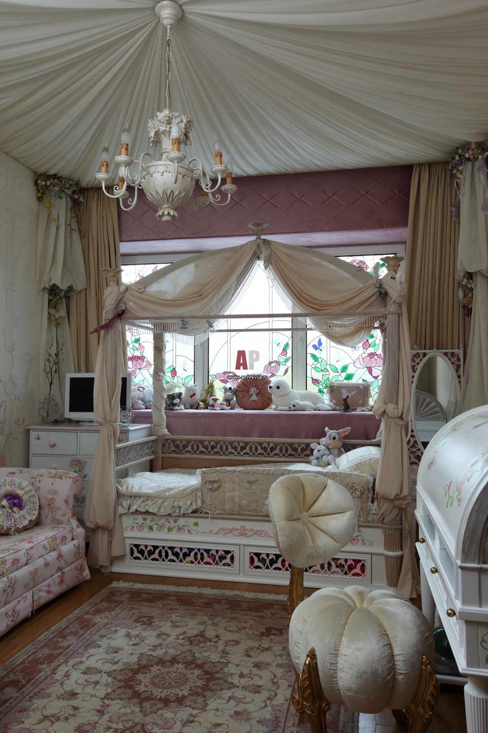 Мебель в детской комнате девочки выполнена на заказ по эскизам архитекторов мастерами компании Mobile Line Décor. Стены декорированы росписью и тканевыми панелями. Потолок оформлен тканью, как купол. В окнах – витражи, которые маскирую не очень привлекательный вид на улицу.