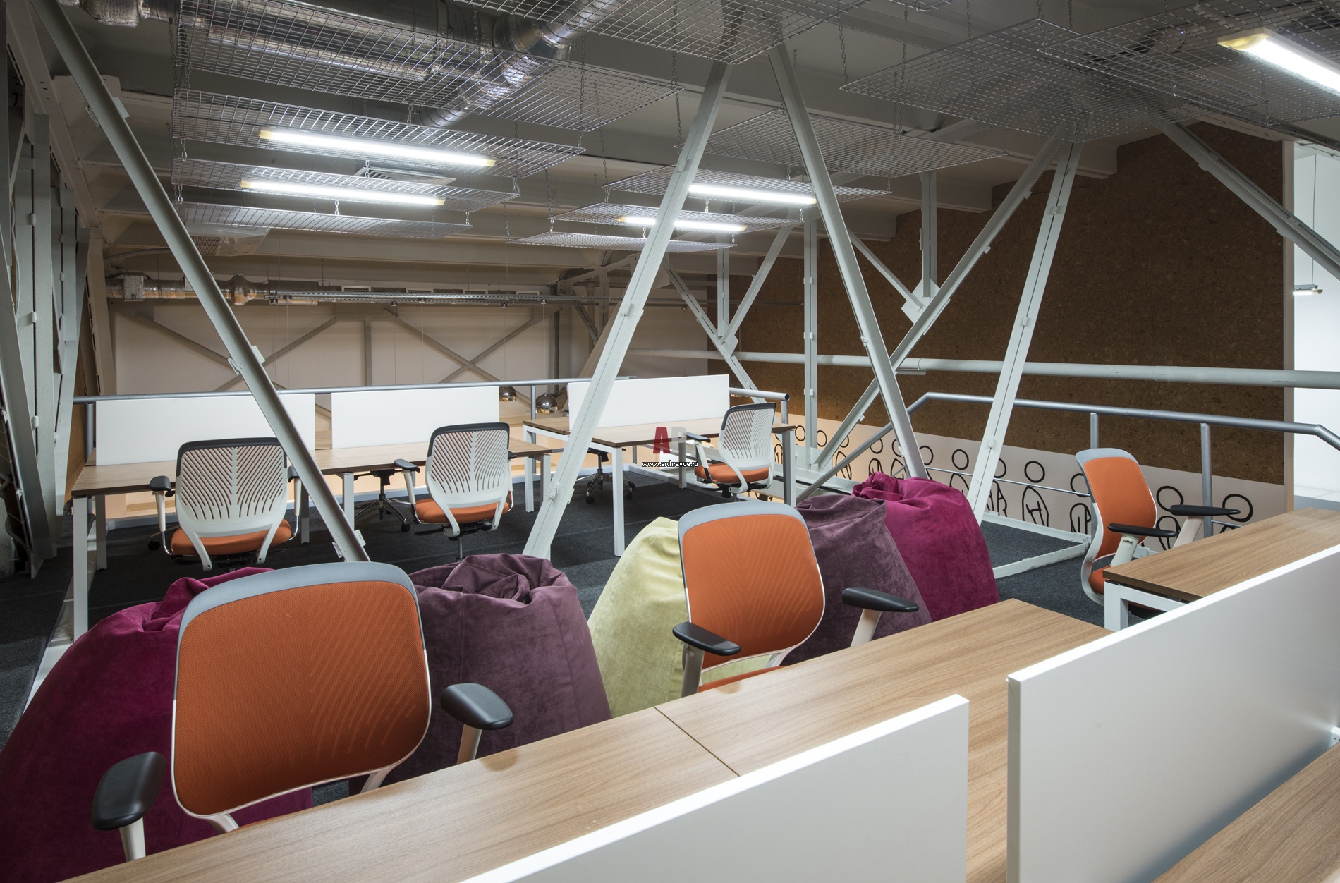 Рабочая зона на втором этаже офиса. Потолки над антресолями выполнены из подвесных хромированных решеток системы Joker. Решетка Joker имеет размер 1х2 м, подвешивается на крюках и цепях в шести точках. Причем вне зависимости от уклона потолка можно отрегулировать горизонтальный уровень решетки за счет звеньев цепи и оборотов крюка. Светильники крепятся непосредственно к решеткам.