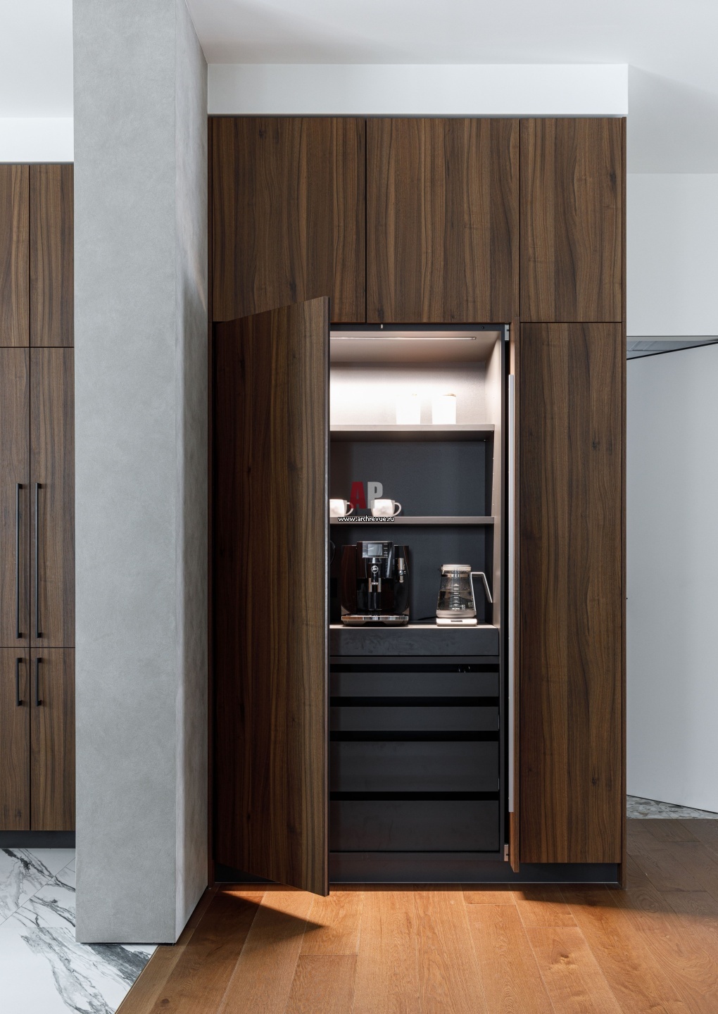 Несущая стена разбивает линию кухни, в отрыве от основной композиции размещен дополнительный буфет с чайным уголком и кофемашиной, который скрыт все мебельными фасадами. Благодаря этому приему кухонная зона увеличивается и смотрится как единое целое.
