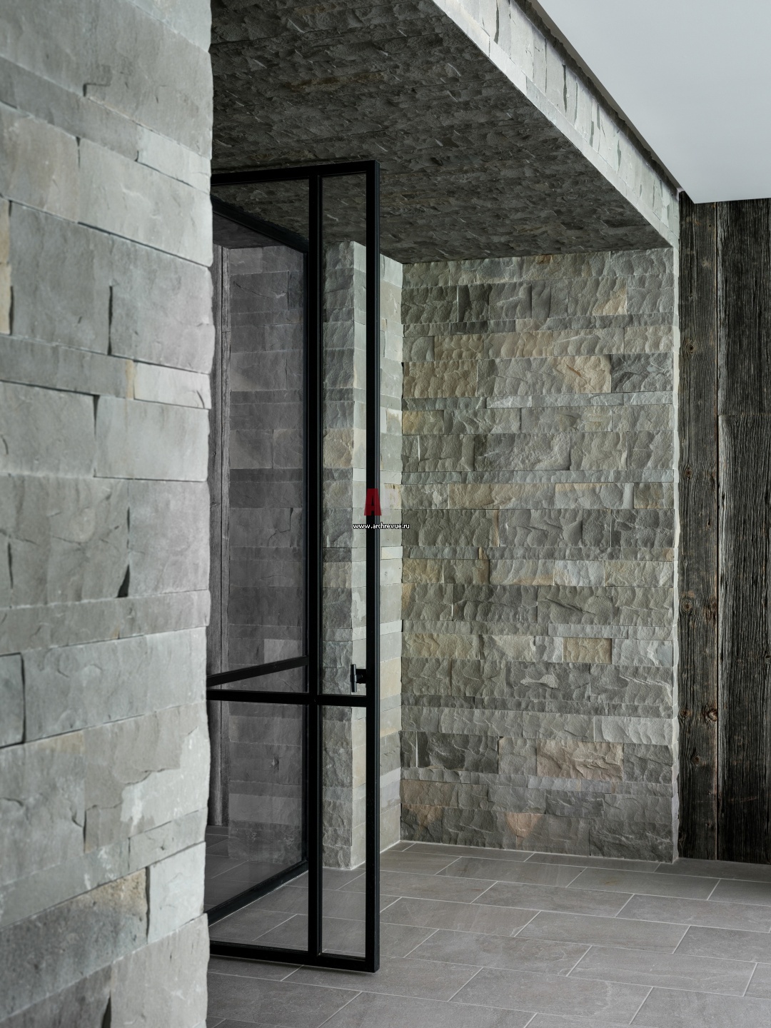 Интерьер бассейна в отделке натуральным камнем с фактурной поверхностью.