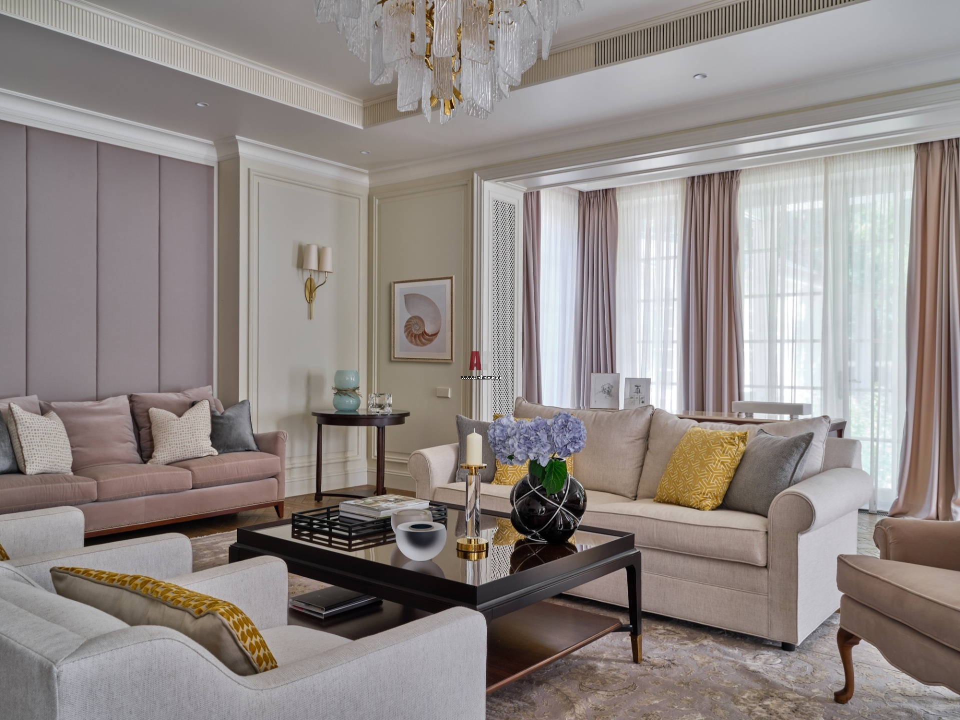 В отделке стен гостиной комбинируется окраска и мягкие текстильные панели, гипсовые молдинги подчеркивают геометрию. На полу – паркет с модульной раскладкой из светлого дуба.