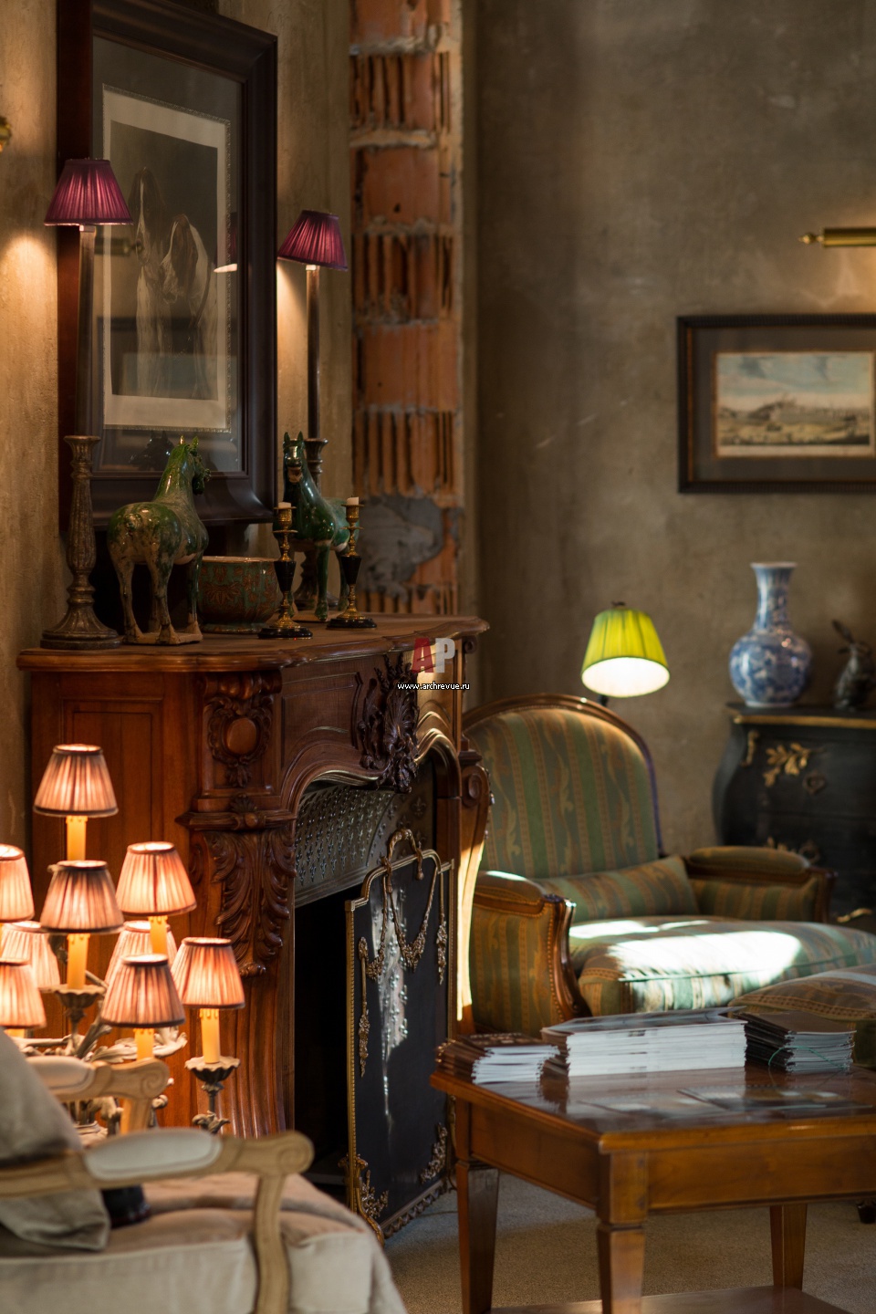 Винтажный интерьер с классической мебелью и антикварным камином.