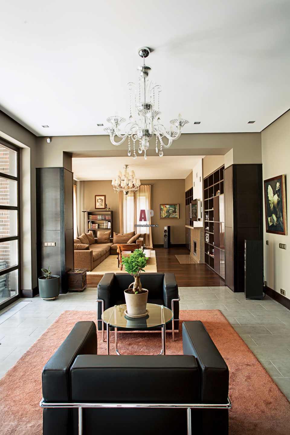 Интерьер гостиной в стиле фьюжн. Просторные общественные помещения плавно перетекают друг в друга через открытые дверные порталы, образуя анфиладу. Цветовая гамма интерьера – сложные серые и земляные оттенки. Мягкая группа с кожаными креслам по дизайну Ле Корбюзье.