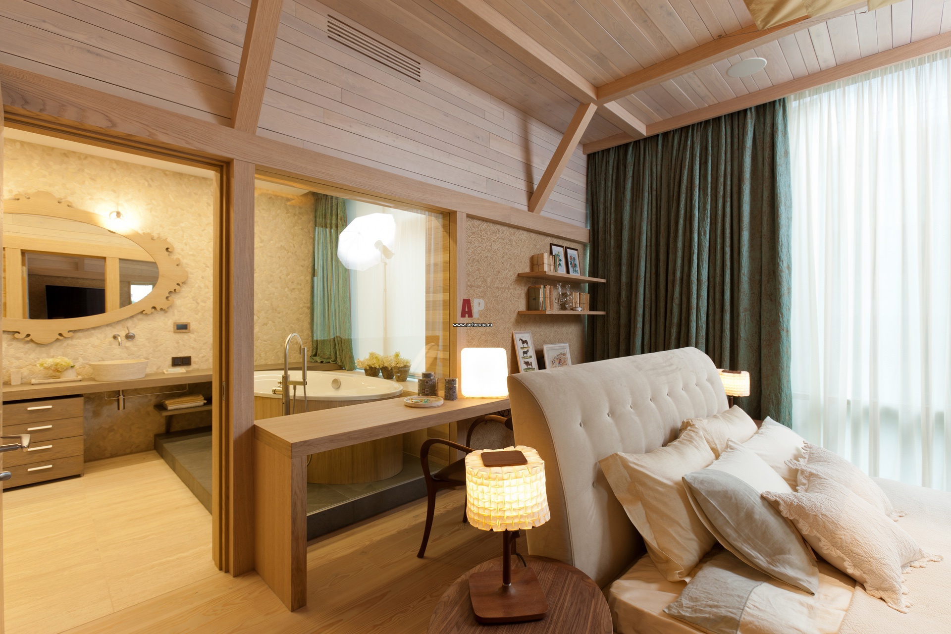 За стеклянной стеной в спальне находится ванная комната. Стены в ванной зашиты панелями из лиственницы, ванна стоит на подиуме из сланца. Стена за умывальником декорирована шлифованной галькой. Раковины из камня установлены на дубовой столешнице.
