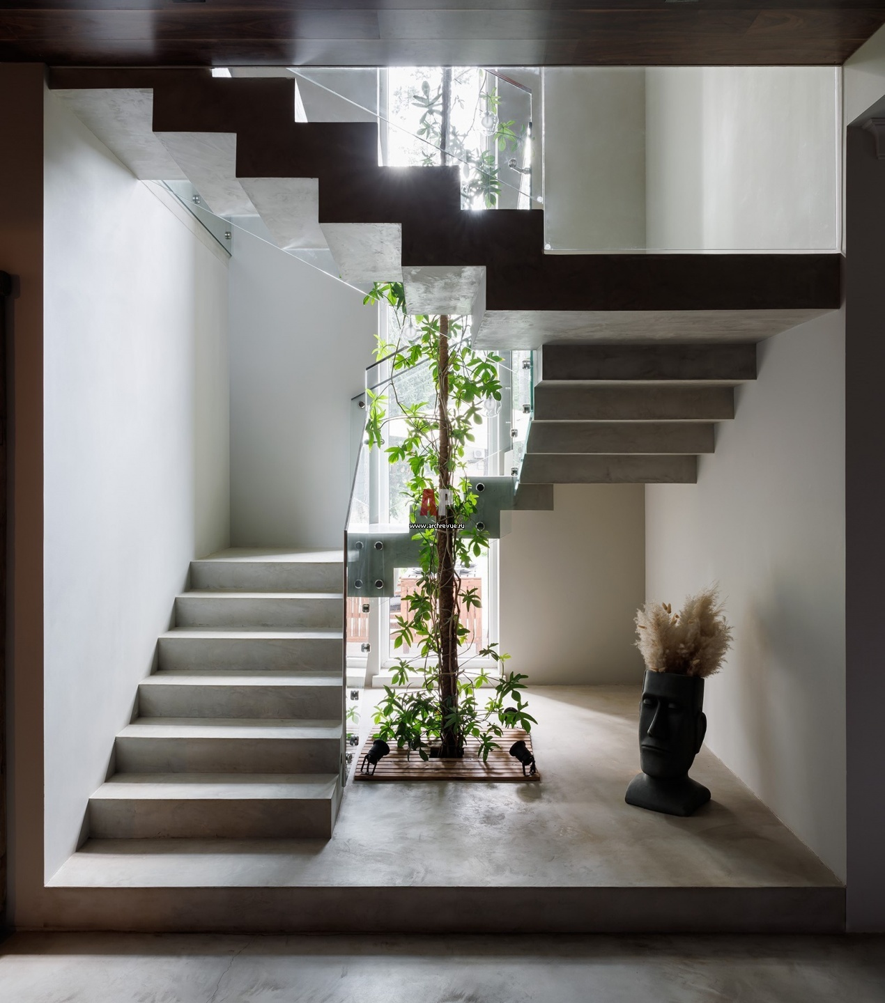 В центре лестничной композиции – живой филодендрон, растение обвивает декоративную колонну до самого верха. Большое световое окно раскрывает вид на сад. Жесткую геометрию поддерживает отделка полов микроцементом и подшивка потолков ламинатом с фактурой дерева.