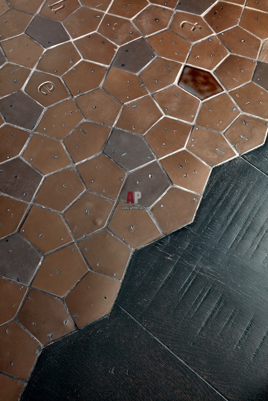 Интерьер прихожей с авторской напольной плиткой. Плитка в форме выпуклых многогранников сделана из обожженной глины с вкраплениями смальты и металла.