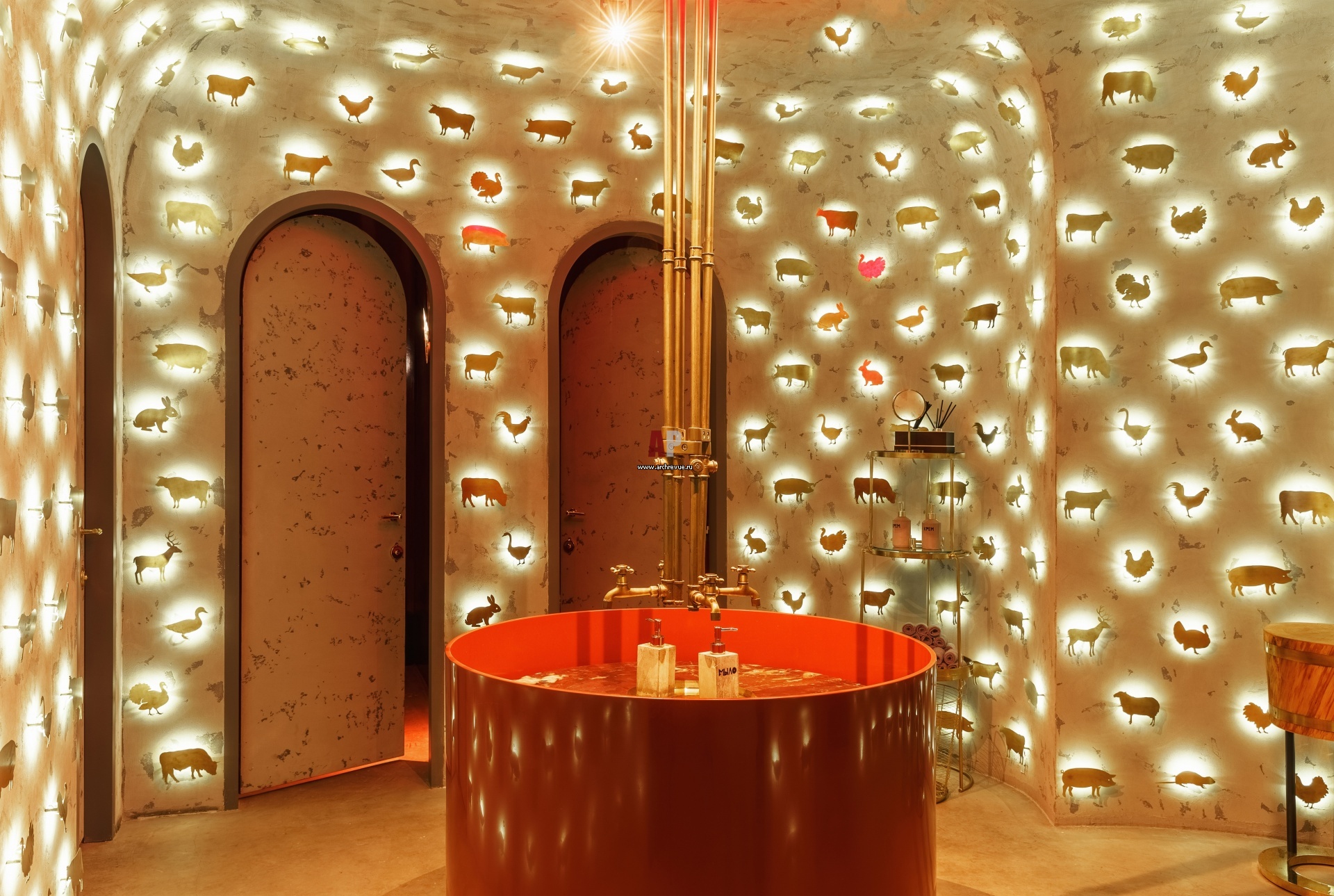 Умывальник расположен по центру, он сделан из металлической трубы, окрашенной в красный глянцевый цвет. Фигурки зверей сделаны из латуни по технологии лазерной резки.