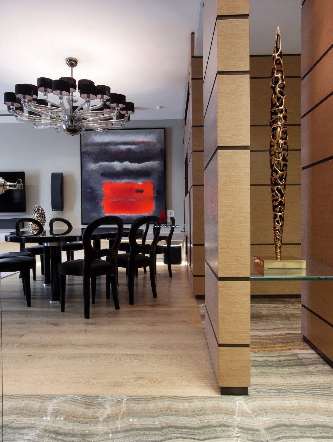 Между двумя колоннами в прихожей размещен стеклянный постамент. На нем – скульптура Джанфранко Меджато. Она повторяет вертикальный ритм колонн.