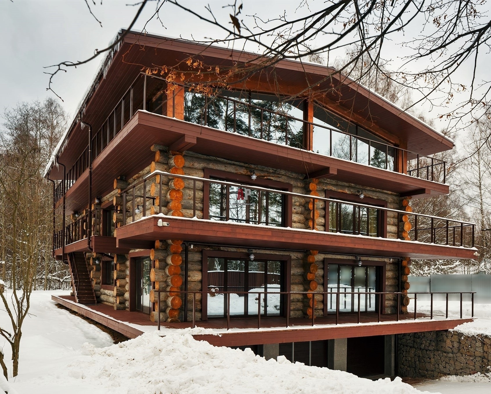 Дом состоит из трех конструктивно разных объемов: подземный двухэтажный выполнен из монолитного бетона, основной надземный двухэтажный – это сруб из кело, мансардный видовой – каркасный, из переклеенного бруса.