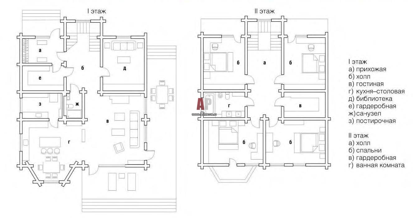 Поэтажный план небольшого двухэтажного деревянного дома в Подмосковье. Общая площадь: 250 кв. м.