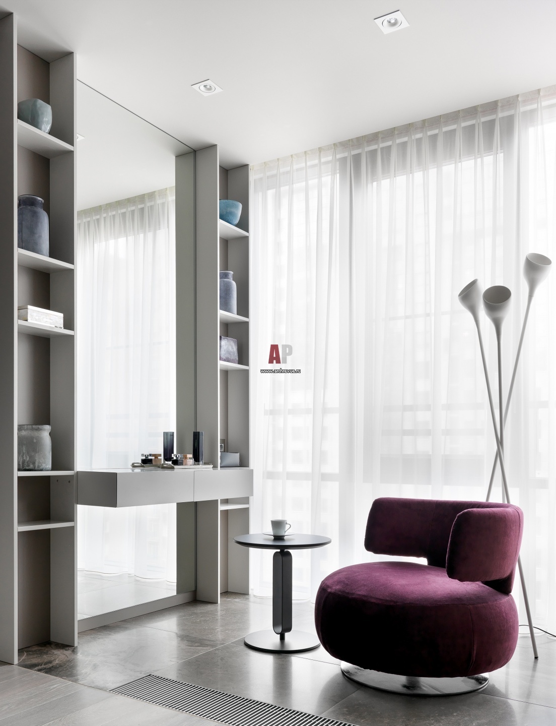 Интерьер главной спальни. На присоединенной лоджии сделан будуар. Туалетный столик изготовлен на заказ. Кресло темного сливового цвета, Roche Bobois.