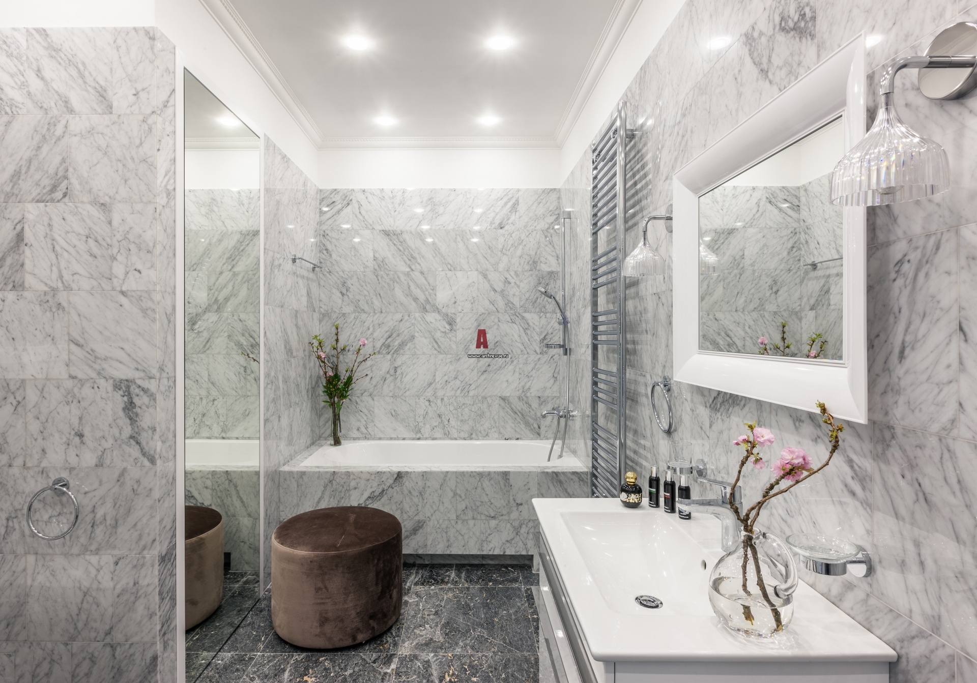 Раньше в ванной располагался подиум, его декоратор демонтировала, создав одноуровневое пространство. Стены и пол облицованы каррарским мрамором благородного серого оттенка. Ванна, раковина, Villeroy & Boch.