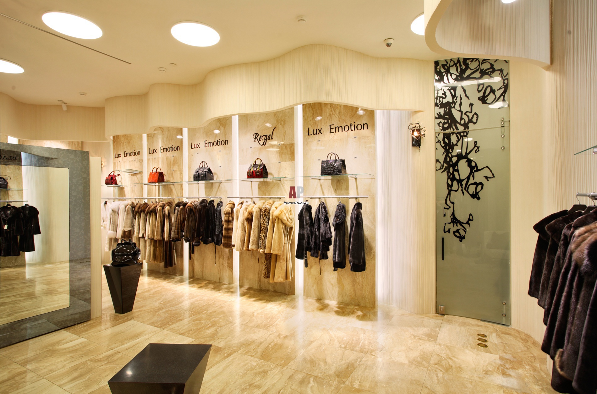 Входы в примерочные комнаты оборудованы дверями из матированного стекла с черным рисунком, поставщик «ОСС».