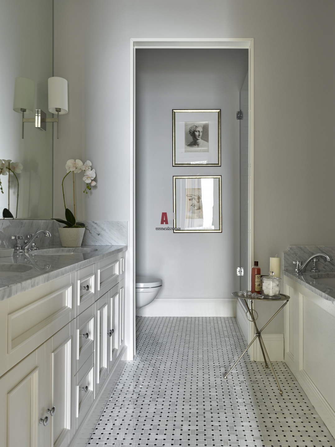 Интерьер ванной комнаты исполнен в стиле неоклассика. Столешница для раковины выполнена из мрамора. Подстолье из дерева с филенками и белой эмалью также сделано на заказ.