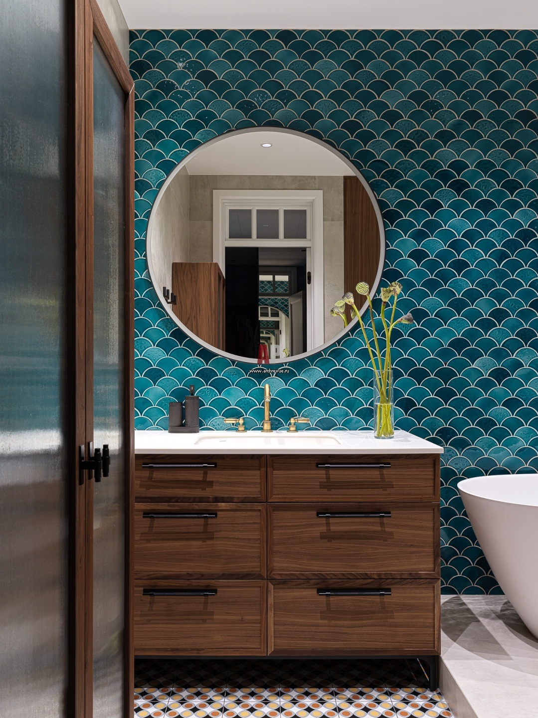 Хозяйская ванная комната. Тумба под раковину, зеркало, шкафы выполнены по эскизам бюро. Бирюзовая плитка-чешуя, Прима Керамика. На полу – плитка, Sant Agostino. Раковина, Laufen. Смесители, Bossini.