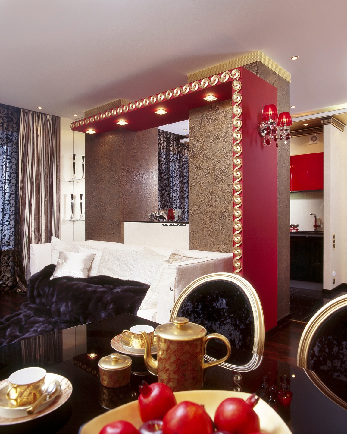 Барная стойка стойка в гостиной. Колонны финишированы штукатуркой с эффектом потрескавшихся старых стен. Позолота кракелюра подсвечивается бра и люстрами с хрусталем Swarovski. Декоративные покрытия Sikkens, поставщик «Дом Краски / Деко – Эм».