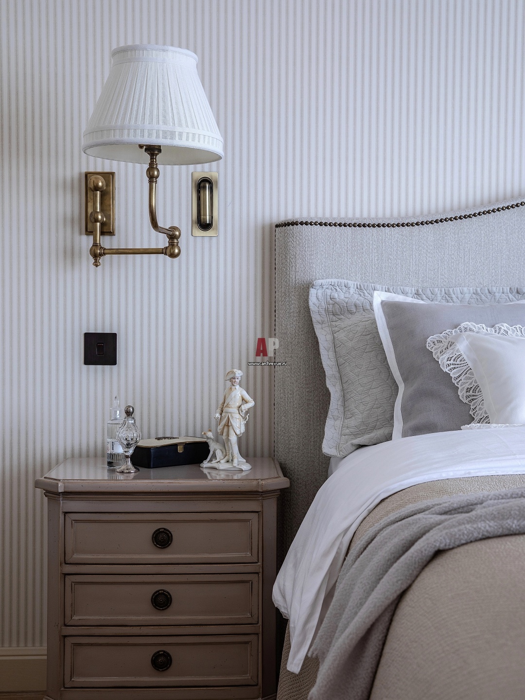 Многоуровневый таунхаус в классическом стиле. Интерьер спальни. Кровать, Dantone Home. Бра, Visual Comfort & Co.