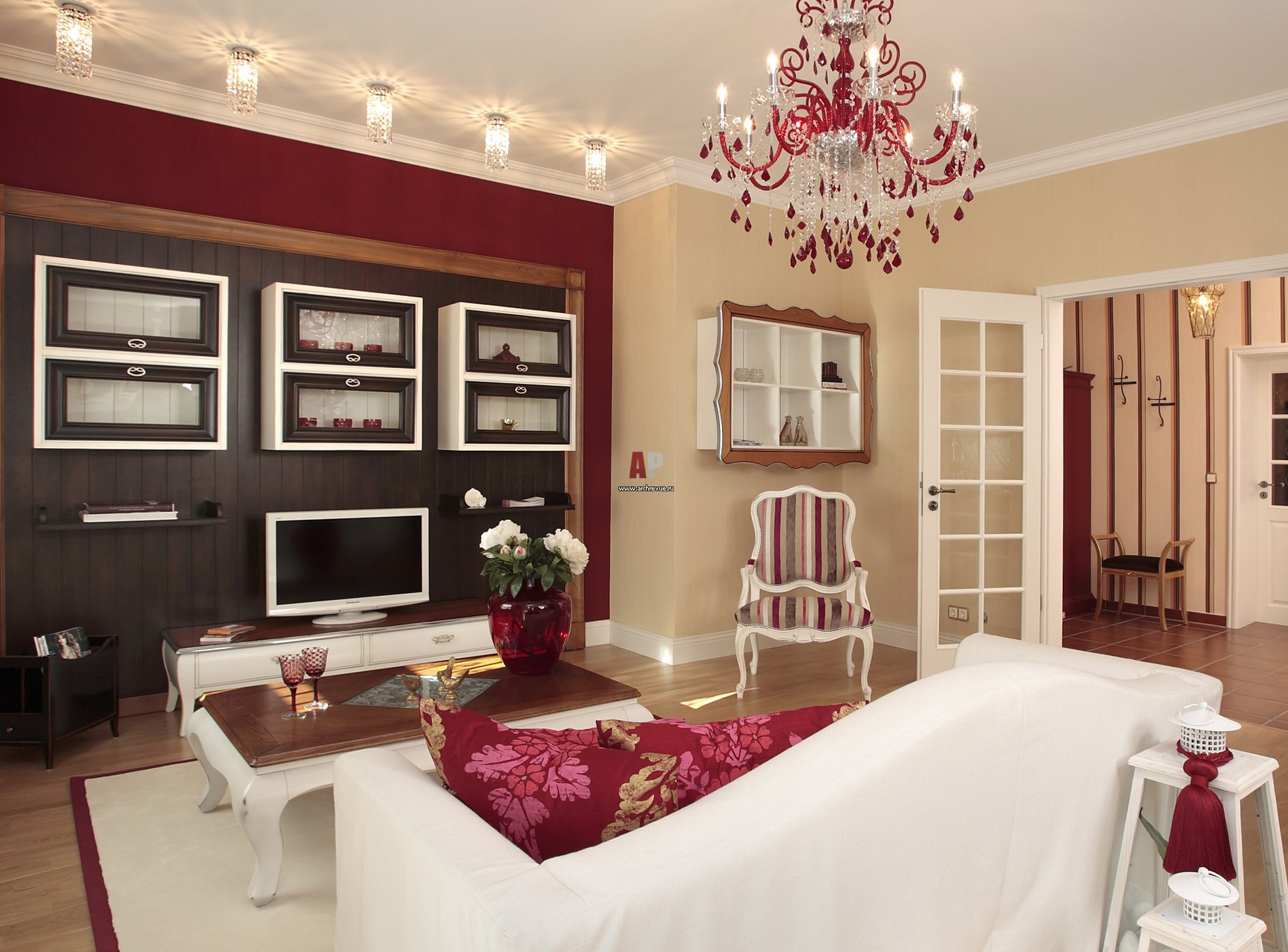 Зона отдыха с телевизионной группой. Зона ТВ обрамлена декоративным порталом из дерева и размещена в нише, оформленной обоями винного цвета. Распашные двери с деревянным переплетом и стеклом выполнены на заказ немецкими мастерами.