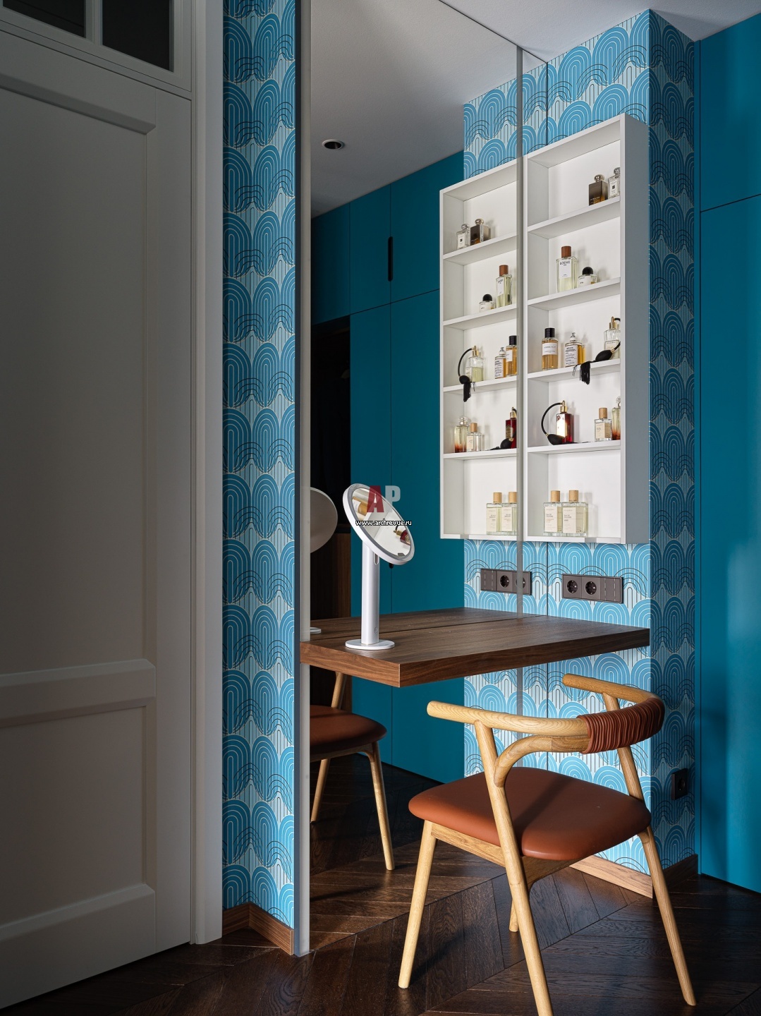 Туалетный столик в гардеробной сделан на заказ. Интерьер оформлен в бирюзовых тонах. Обои с рисунком, PapierPeint. Стул, La Redoute.