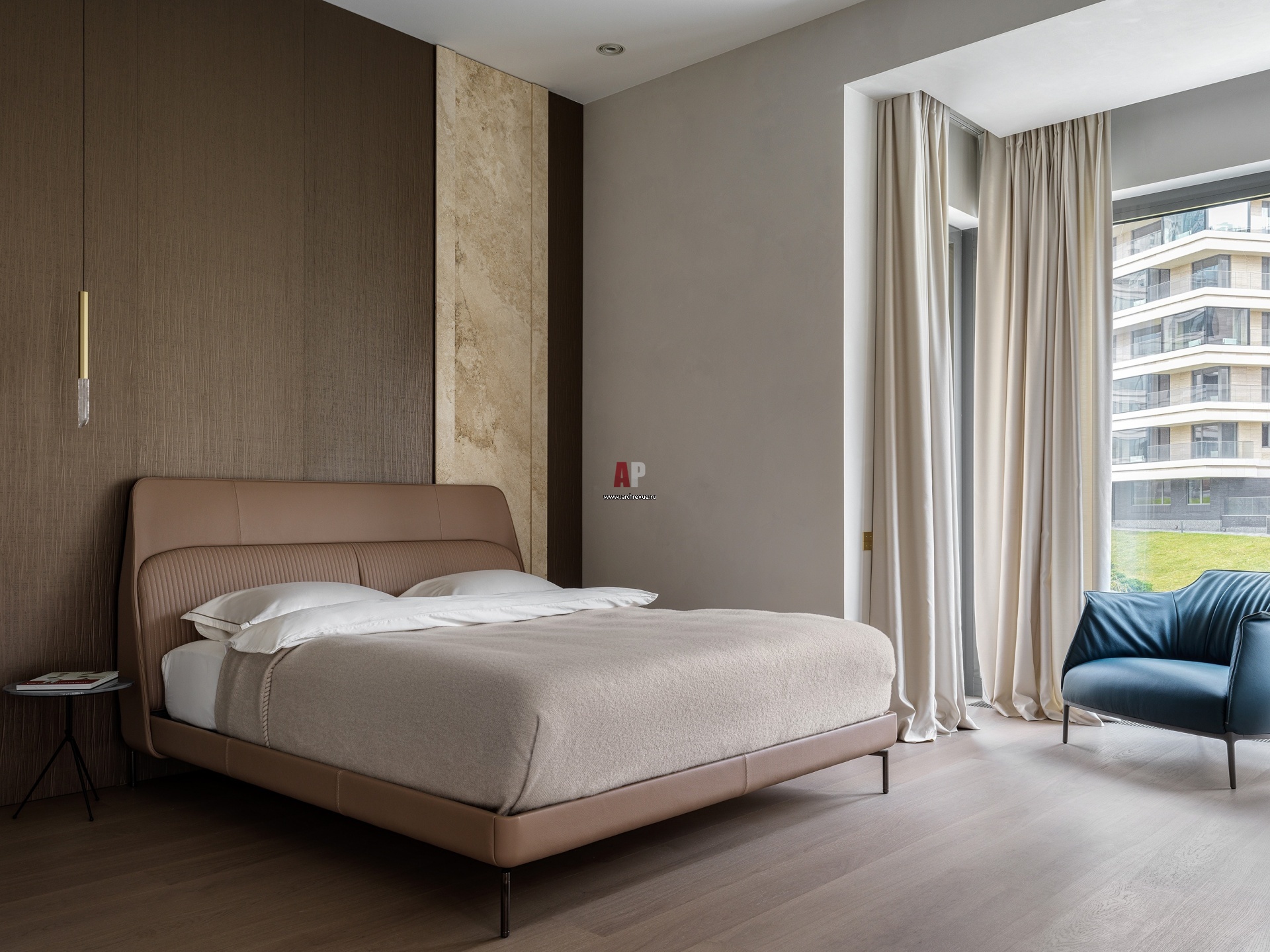 Мастер-спальня. Кровать, Poltrona Frau. Стеновые панели за изголовьем, Bluinterni. Прикроватные столики, Baxter.