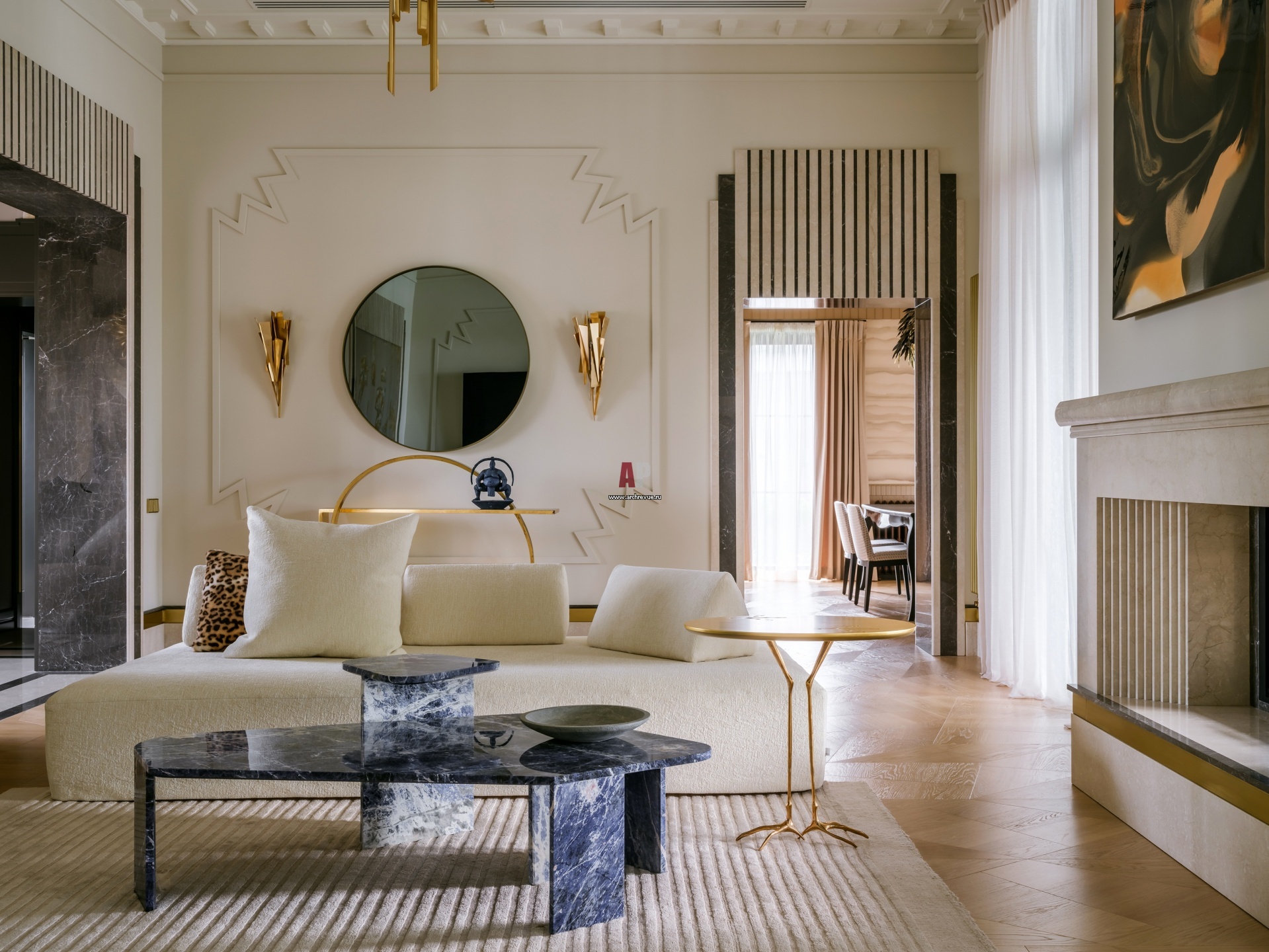 В проходной гостиной дизайнер выровнял высоты порталов декоративными обрамлениями из мрамора. Люстра, бра, Sigma L2. Зеркало, Sovet Italia.