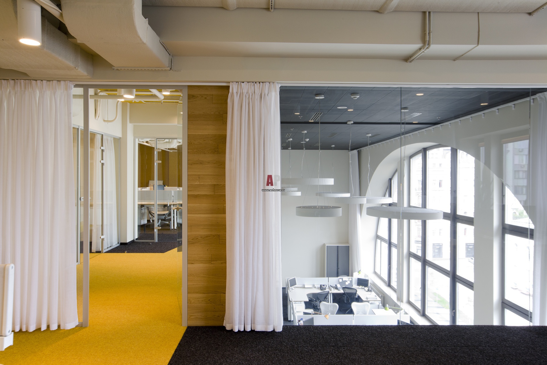 Интерьер второго этажа офиса в минимализме. Авторы проекта Петр Зайцев, Арсений Борисенко, архитектурное бюро za bor. Вид на переговорную. Раздвижные стеклянные перегородки, NAYADA.
