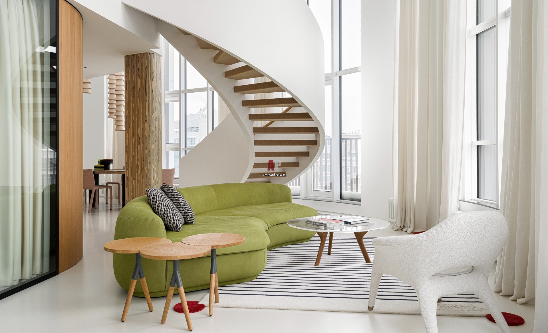 Общая гостиная со скульптурной лестницей – светлое чистое пространство с необычными формами и сочетаниями цветов и материалов. Диван яркого салатового цвета, Baxter. Кресла, Ligne Roset, Roche Bobois. Ковер, Roche Bobois.