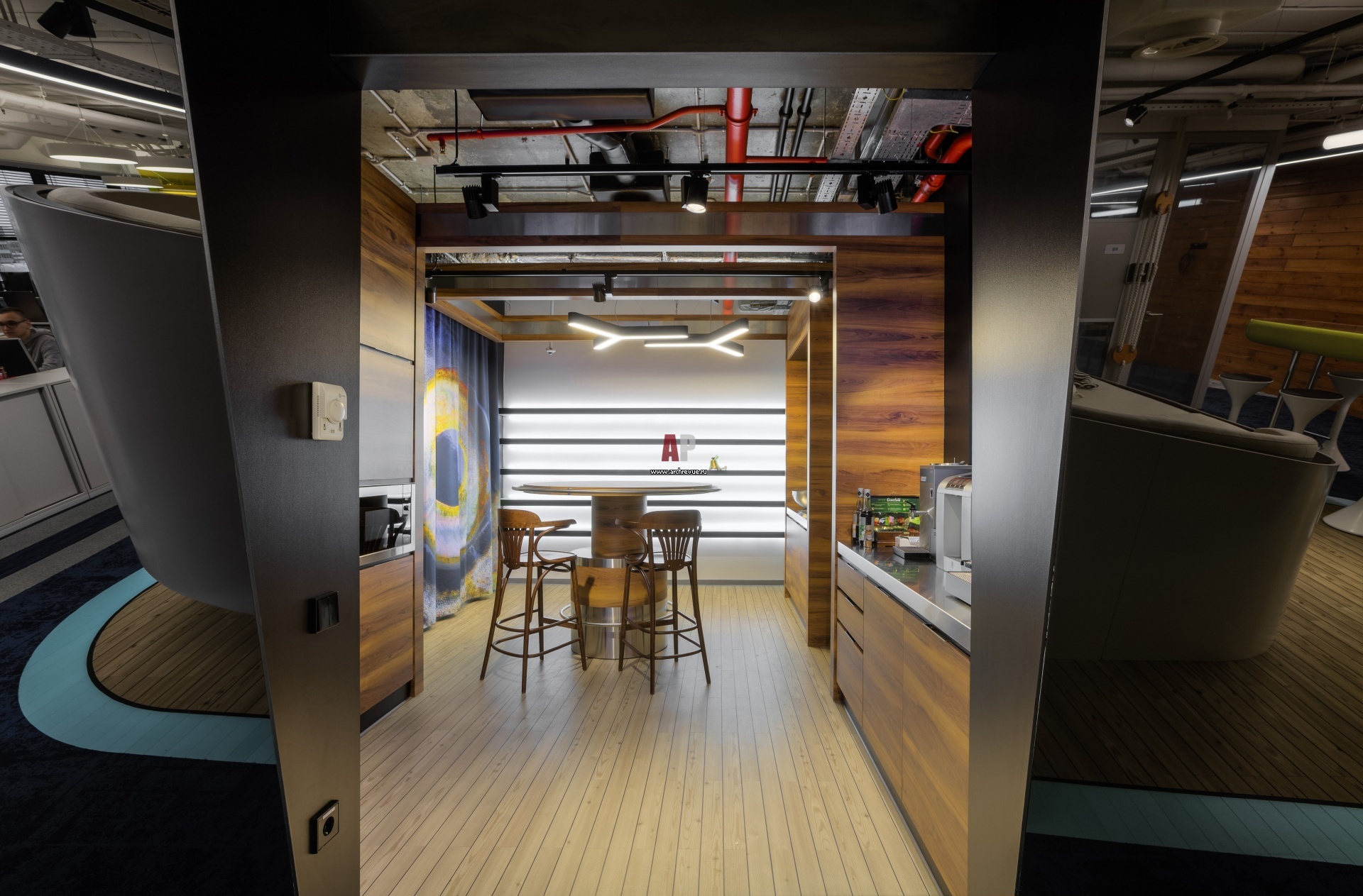 Зона кофе-поинта. Стены зашиты деревом и напоминают отделку трюма корабля.