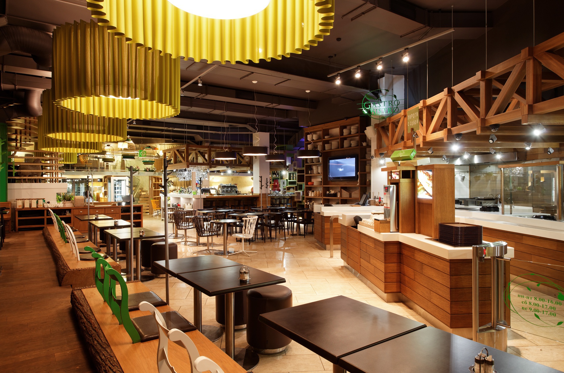Дизайн-проект интерьера зоны фри-фло (свободного доступа) с открытой кухней в современном стиле с деревянной отделкой.