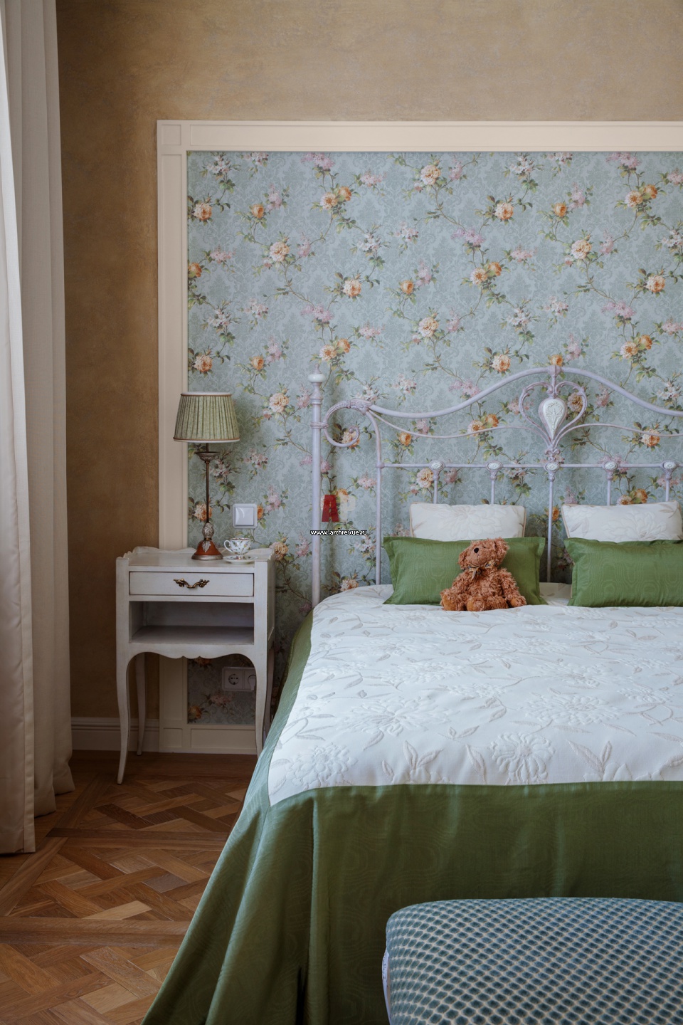 Фото интерьера детской спальни дочери. За изголовьем кованой кровати – «панно» из обоев с цветами на голубом фоне, рамой ему служит гипсовый молдинг.