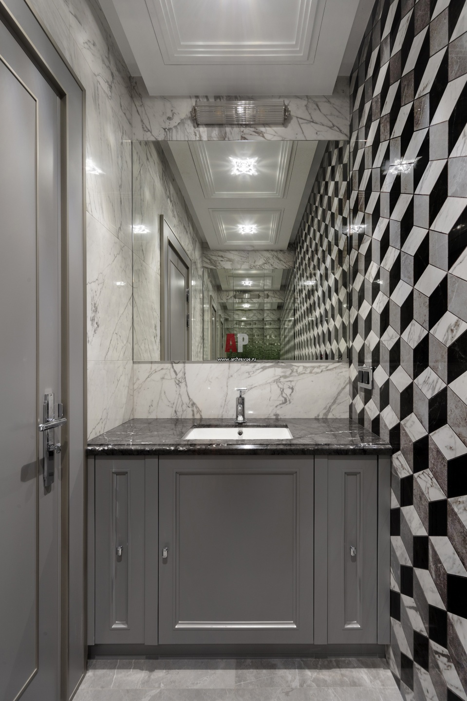 Монохромный гостевой санузел выглядит необычно за счет отделки одной из стен наборным камнем. Расположенные друг напротив друга зеркала создают интересный эффект перспективы.
