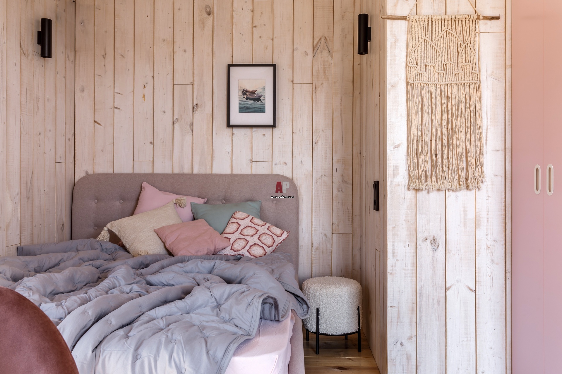 Детская в розовых тонах. Стены зашиты деревом. Кровать со встроенным отсеком для хранения. Пуф, Gilini Home.